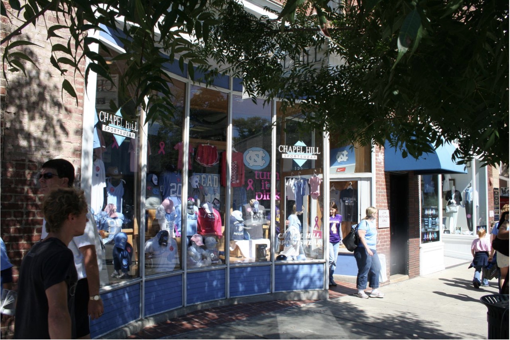 In 1989, the building was sold once again to Kathy Sapp, where it became Chapel Hill Sportswear. A UNC alumna, she has been a part of the Chapel Hill community for many years.3 Chapel Hill Sportswear has been a staple since its founding, and it got its start in 133 East Franklin Street. In the iconic curved windows, students walking past would be enticed by the apparel. From 1989 to 2011, the building sold Carolina gear until Chapel Hill Sportswear moved down the road to 119 E Franklin.